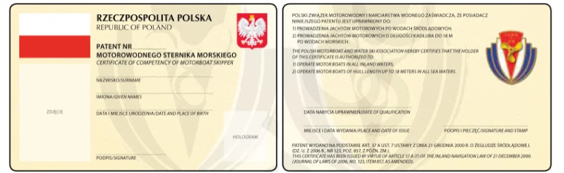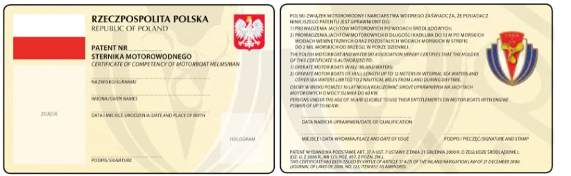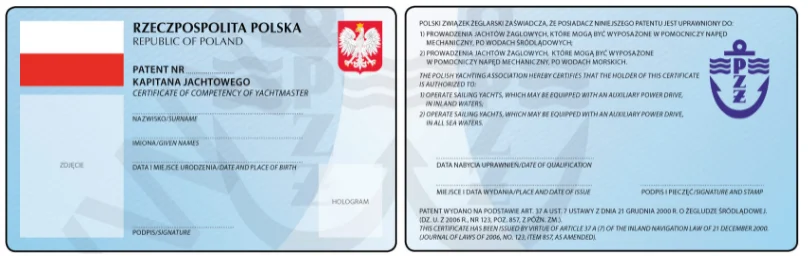 W Polsce dokumentami kwalifikacjami potwierdzającymi posiadanie uprawnień do uprawiania turystyki wodnej na jachtach żaglowych o długości kadłuba powyżej 7,5m lub motorowych o mocy silnika powyżej 10kW są następujące patenty:
